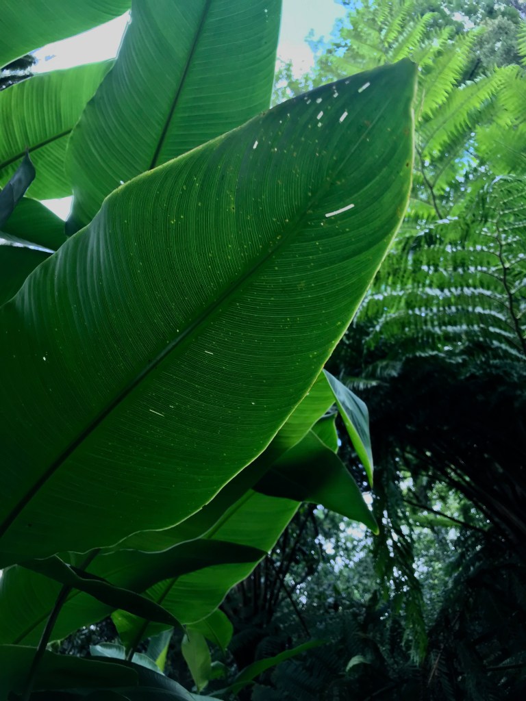 Las enormes hojas nos hacen de sombrilla mientras esperamos nuestro turno: