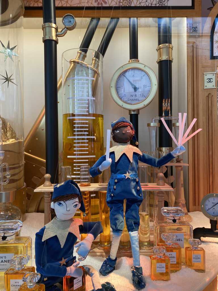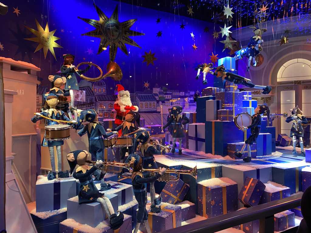 Nuestra primera parada es el centro comercial Printemps Haussmann, conocida sus escaparates con muñecos y marionetas en movimiento Navidad tras Navidad. Este año no han sido vacas ni ratoncitos, sino elfos vestidos de azul, creación de Aurelia Fonty.
