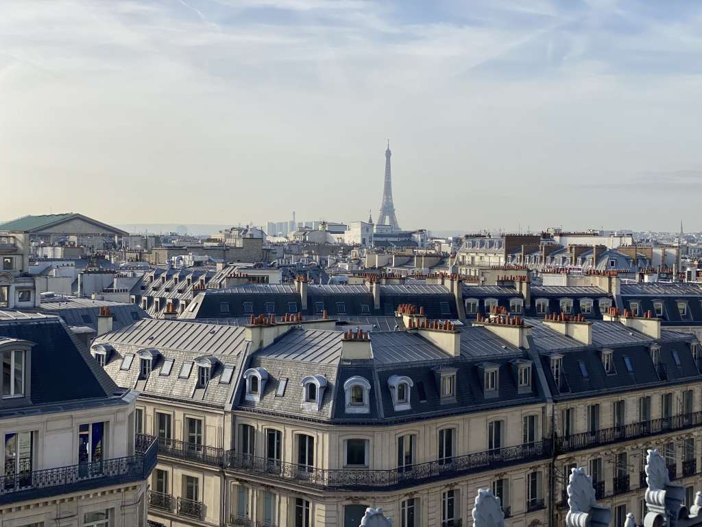 Al salir a la terraza nos encontramos unas vistas espectaculares de los tejados de París coronados por la Torre Eiffel.