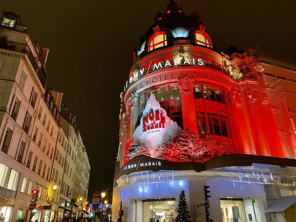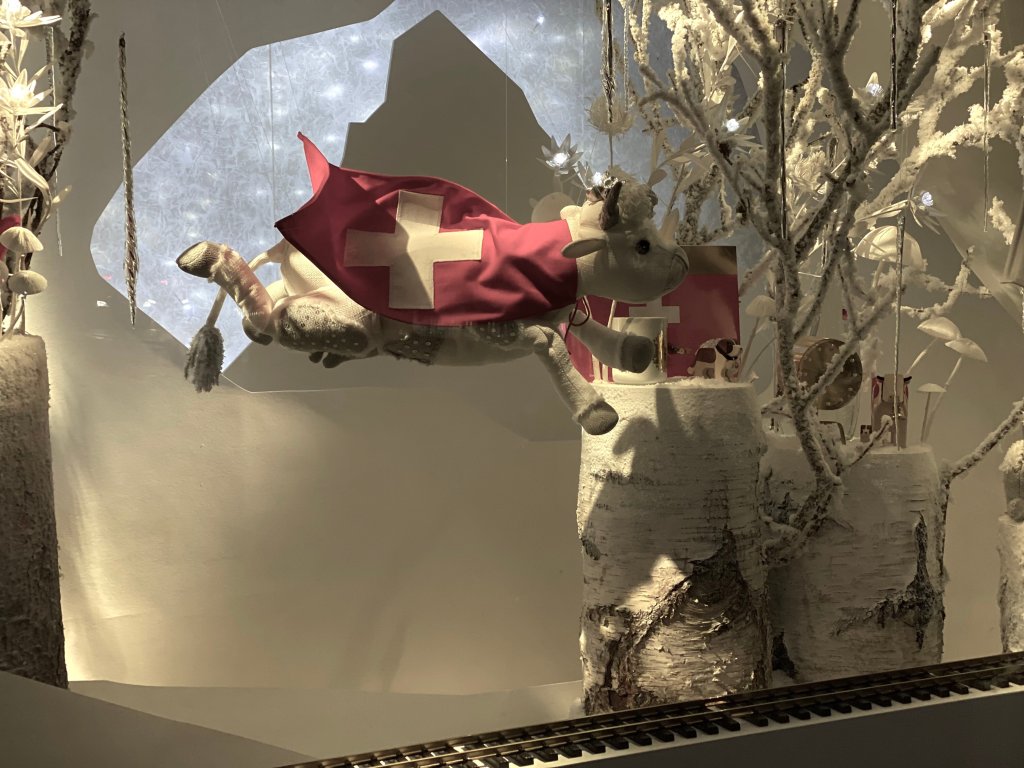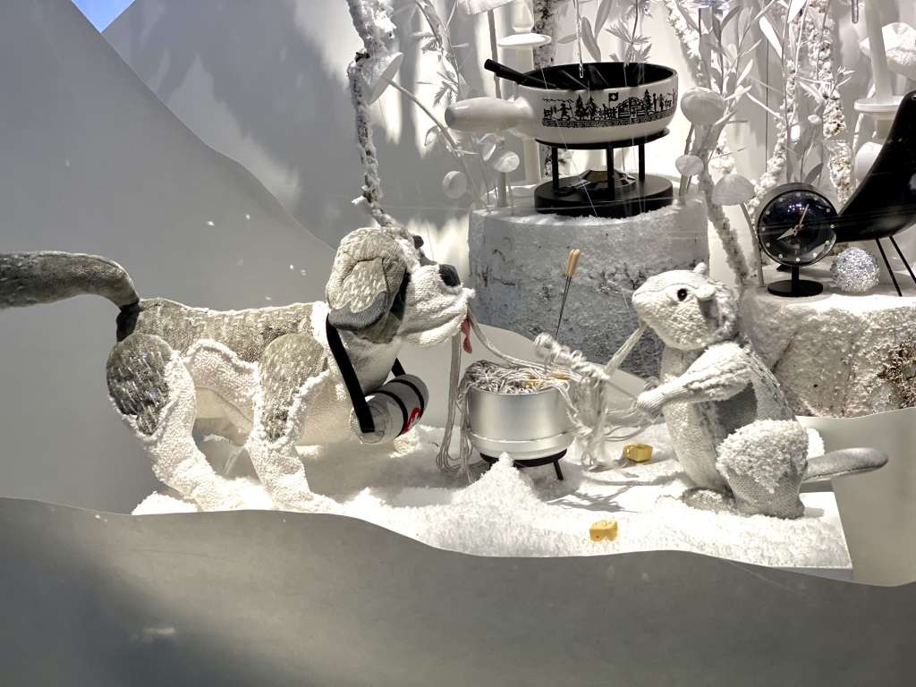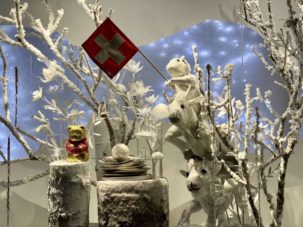 El Bazar de Hôtel de Ville este año celebra unas Navidades a la suiza bajo el título «Noël au Sommet, La Suisse», por lo que las marionetas de sus escaparates llevan su bandera y comen fondue de queso.