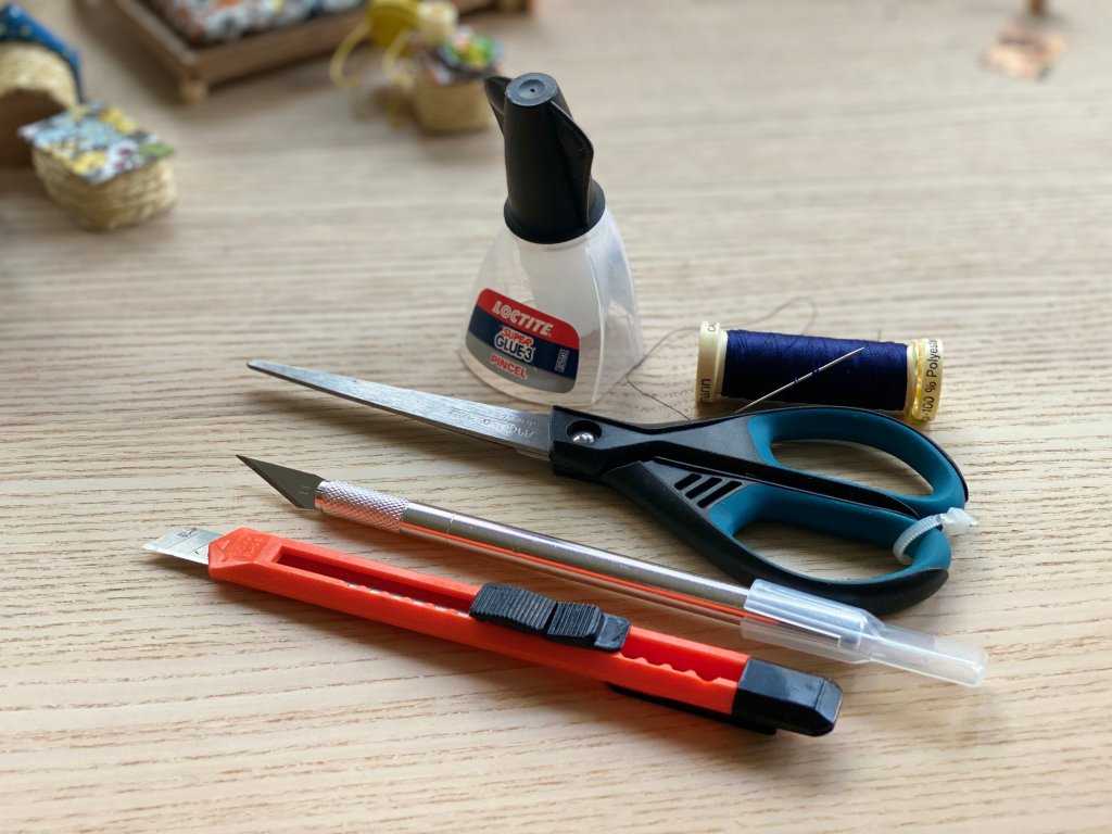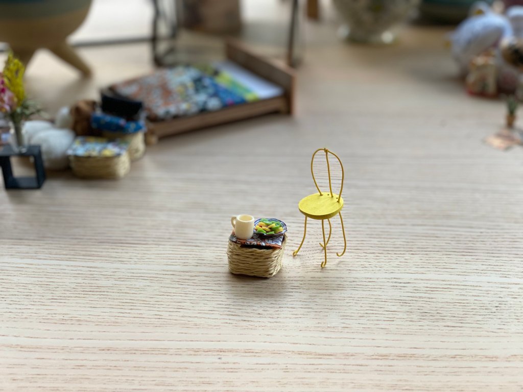 Cestitas, una escoba tradicional y un felpudo hechos con hilos de mimbre, trocitos de tela, cartón, y cola blanca: