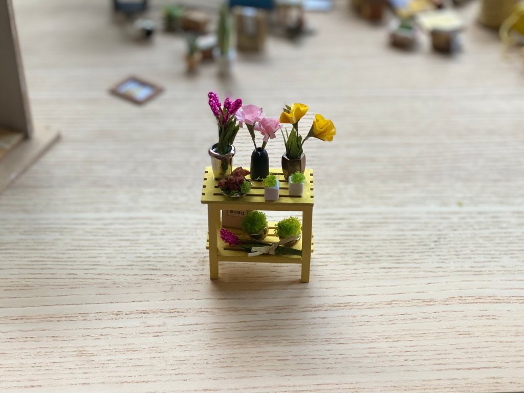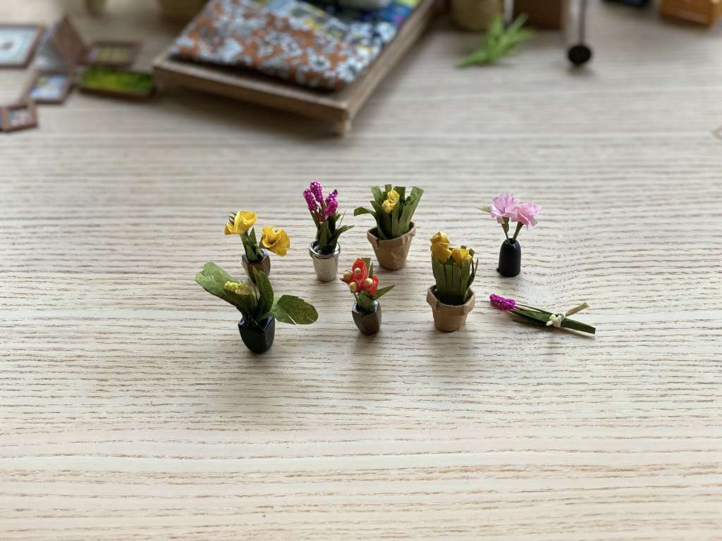 Aquí comienza el trabajo de precisión: papeles de seda, alambres, abalorios, cartón (y mucha paciencia) para conseguir maceteros, jarrones y ramilletes de -mini- claveles, tulipanes y jacintos: